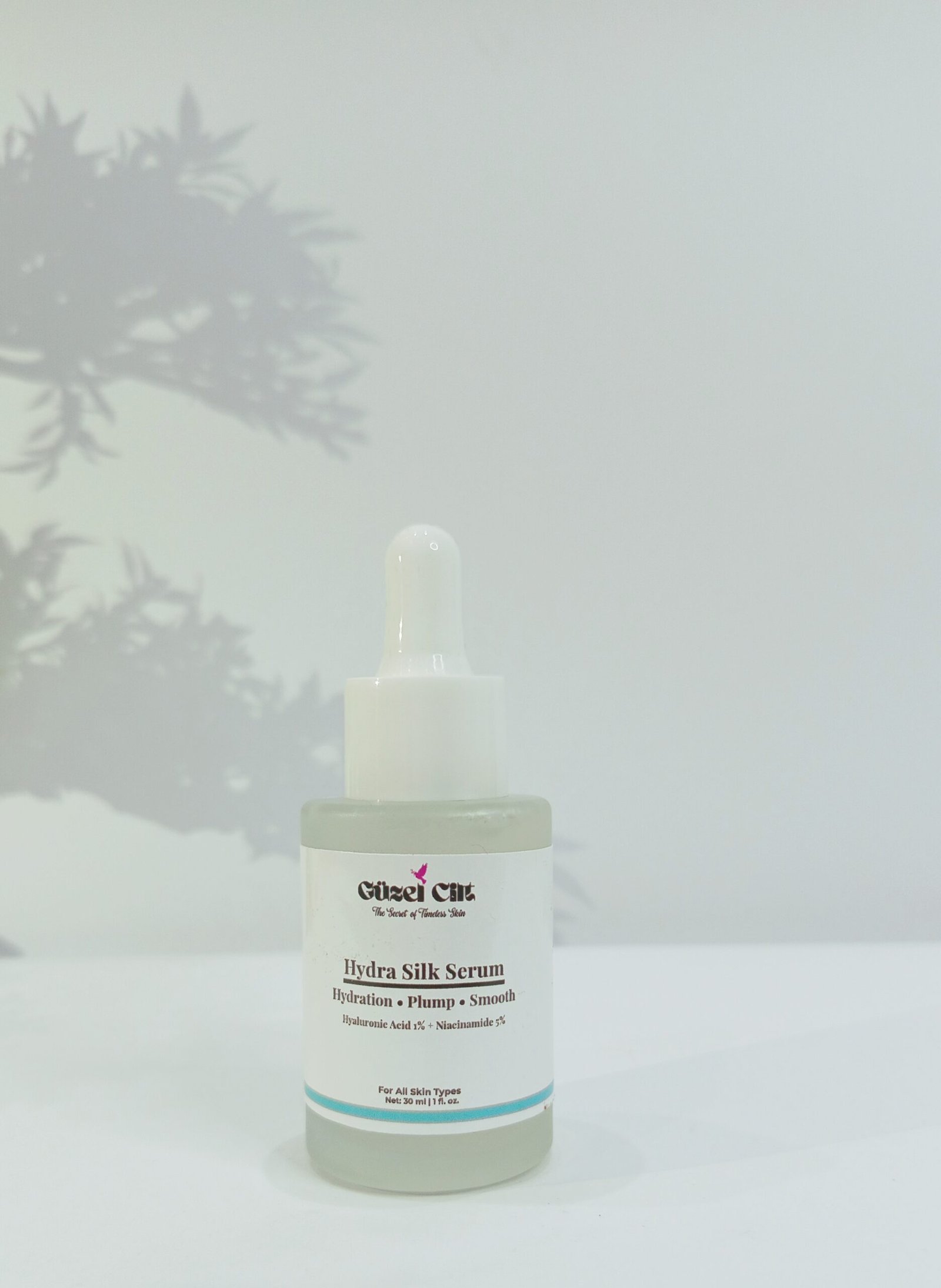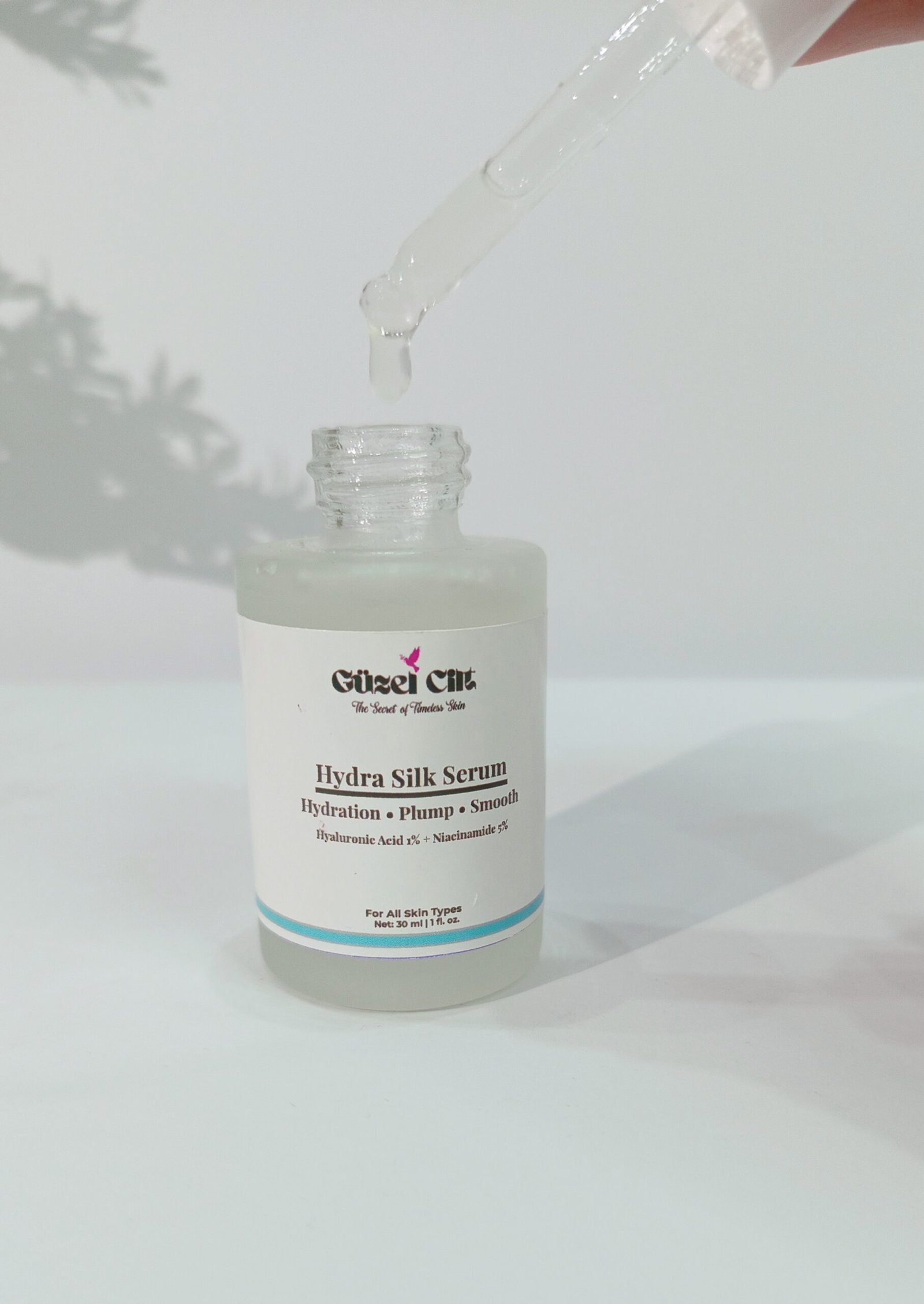 Indulge your skin in the luxurious touch of Our Hydra Silk Serum — a deeply hydrating elixir designed to deliver instant and long-lasting moisture. Infused with multi-molecular Hyaluronic Acid, Niacinamide, and Pro-Vitamin B5, this lightweight serum replenishes skin’s moisture barrier, enhances elasticity, and leaves the complexion silky-smooth, supple, and radiant. Ideal for all skin types, especially dull, dehydrated, and tired skin in need of a luminous boost.